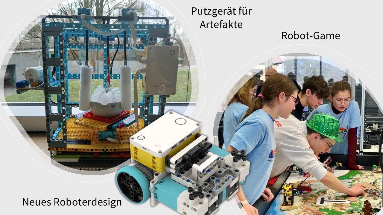 Die Jury zeichnete Leonard (Jg1), Robin (9b), Erik (9d), Theresa (8a), Lennox (8a), Alisa (8b), Yvonne (7a), Elisa (6a) und ihre Teamchefin für die intensive Arbeit in den letzten Wochen und Monaten aus. Zusammen mit unserem erfahrenen Lego-Baumeister Mathieu (Jg2) hatten sie ihren Lego-Roboter radikal rekonstruiert, sich peu à peu in dessen Programmierung mit Python hineingefuchst und souverän verschiedene Strategien für das Robot-Game erprobt. Denn bei dem Wettbewerb musste ein selbst entwickelter Roboter in nur zweieinhalb Minuten auf einem Spielfeld verschiedene Aufgaben autonom lösen: Artefakte sicher bergen, Fundstellen markieren oder Statuen aufrichten.