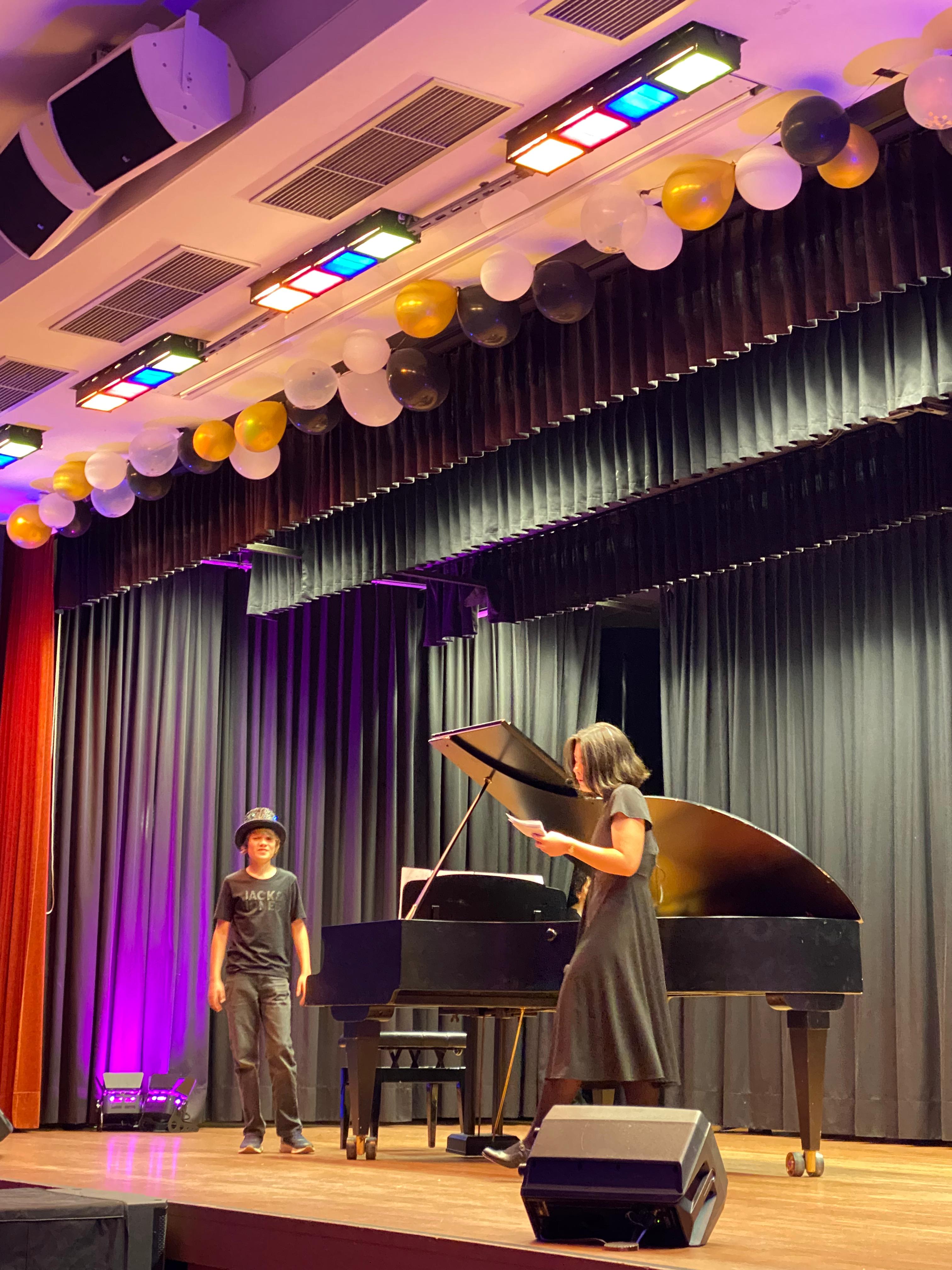 Für einen energiegeladenen Start in den Abend sorgte die Turn-AG mit einer Airtrack-Vorführung; anmutiges Harfen- und Pianospiel sowie Gesang setzten den Abend auf hohem Niveau fort. Auch einige tänzerische Darbietungen durfte das Moderatoren-Duo, bestehend aus zwei SMV-Schülern, ankündigen – ganz unterschiedliche Tänze wie Contemporary-Ballett, Hip Hop oder lateinamerikanische Tänze entführten das Publikum in der ersten Hälfte der Talentshow in unterschiedliche rhythmische Welten. In ganz anderer Hinsicht wurde Rhythmus durch einen jungen Schüler interpretiert, der gekonnt und humorvoll Zungenbrecher auf die Bühne brachte.