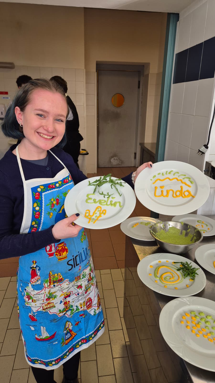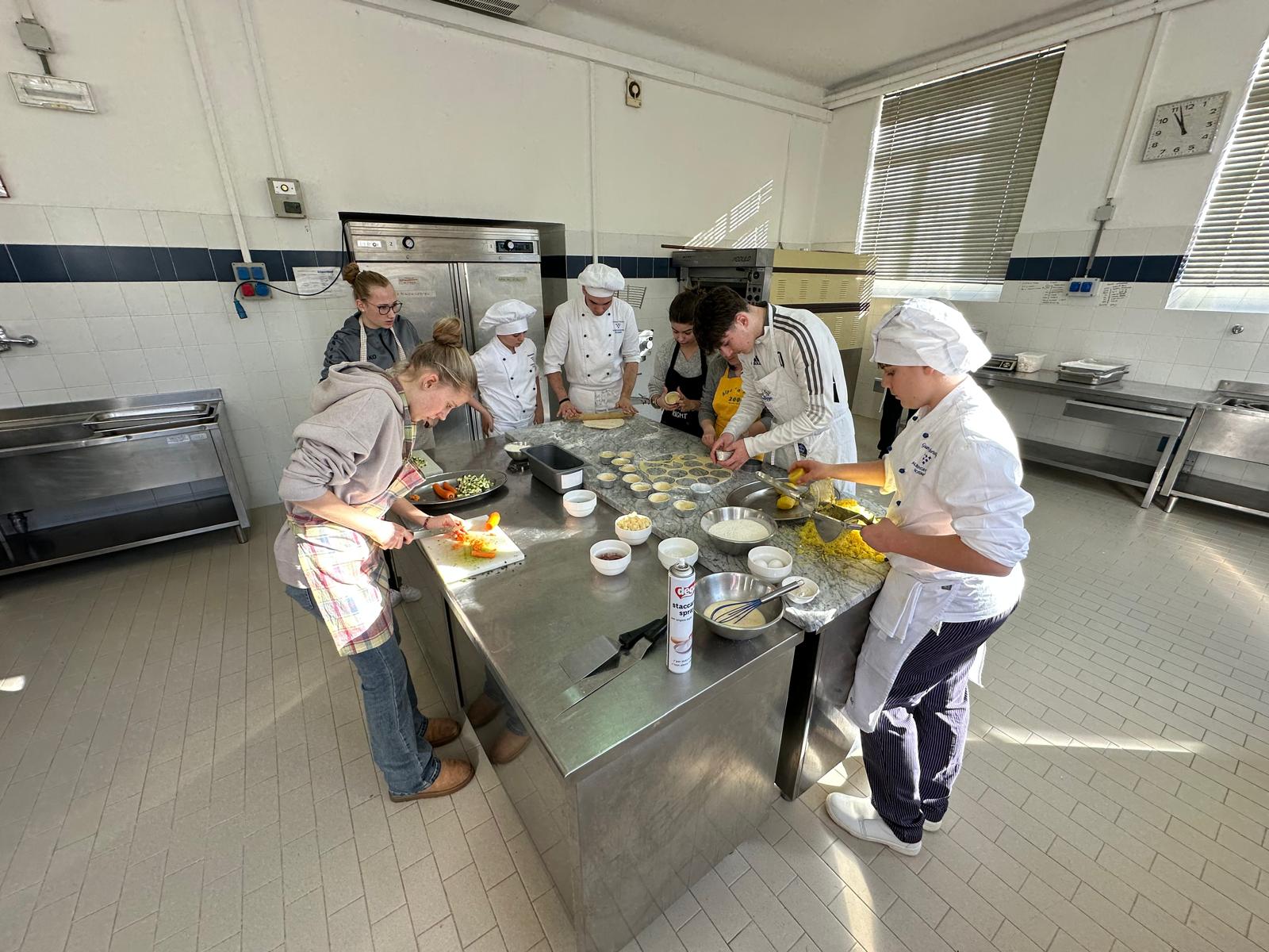 Am Donnerstag standen Unterrichtsbesuche und ein Kochkurs auf dem Programm. Wir trafen uns um 8:00 Uhr morgens im Liceo G. Spezia. Zu Beginn besuchten wir in Vierergrüppchen die verschiedensten Schulfächer. Anschließend machten wir uns auf den Weg zum Collegio Mellerio Rosmini, eine Hotelfachschule, in der wir einen Kochkurs absolvierten. Als erstes erhielten wir eine kurze Vorstellung über das heutige Menü. Dieses bestand aus einer Mini-Quiche als Vorspeise, Gnocchi al Pomodoro als Hauptgang und einer Torte mit Rosinen und einer Kugel Vanilleeis dazu als Dessert. Alle Produkte waren ausschließlich aus der Umgebung, der Schwerpunkt lag hierbei auf der Nachhaltigkeit. Wir kochten die einzelnen Gerichte in verschiedenen Gruppen und dekorierten Teller mit einer Spinat- und Karottensoße, dabei konnten wir richtig kreativ werden und unserer Fantasie freien Lauf lassen. Das sah am Ende klasse aus. Danach sind wir in den Essenssaal gegangen, wo wir unsere hungrigen Austauschpartner erwarteten. Wir servierten ihnen unsere selbstgekochten Speisen, mit Hilfe von angehenden Servicekräften, die in der Hotelfachschule ausgebildet werden. Wir speisten genüsslich mit unseren italienischen Austauschpartnern und beendeten den gemeinsamen Tag um ca. 13:45 Uhr.
